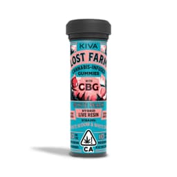 10mg THC : 10mg CBG per piece | 100mg THC : 100mg CBG total in 10 pieces Infused with White Widow and White CBG Live Resin Lost Farm Fruit Chews and Gummies are strain-specific, plant-based confections made with 100% live resin. These edibles immortalize the fresh cannabis plant and harmoniously combine it with fruit flavors that enhance each strain’s unique profile. The result is a full-sensory, ultra-fresh, and extra-strength edible STRAIN NOTES: This potent double hybrid blend marries the highly-popular White Widow strain with the high CBG strain White CBG. The duo's earthy, herbal aromas complement a range of euphoric, carefree experiences both solo and social. FLAVOR NOTES: Tart, juicy, and sweet, White Peach delivers a tangy punch upfront, with a divine dance of woody, earthy notes of White Widow and White CBG. Disclaimer: Because of the unique nature of the cannabis industry, each Kiva product is produced in the state in which it is sold. Accordingly, the content of THC and other cannabinoids may vary depending in which state you purchase your product. Similarly, the ingredients and allergens may also vary slightly by state. For the most accurate potency, ingredient, and allergen information, please refer to your product package. Flavors Earthy Spicy/Herbal Blueberry